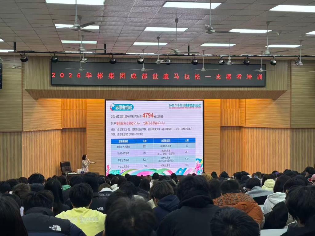 为全力保障2026华彬集团成都世遗马拉松赛事顺利举办,充分展现yl7703永利集团学子良好精神风貌与专业服务素养,3月15日,成都世遗马拉松组委会专程为公司近2000名赛事志愿者开展4场全方位、系统化的赛前专项服务培训。
