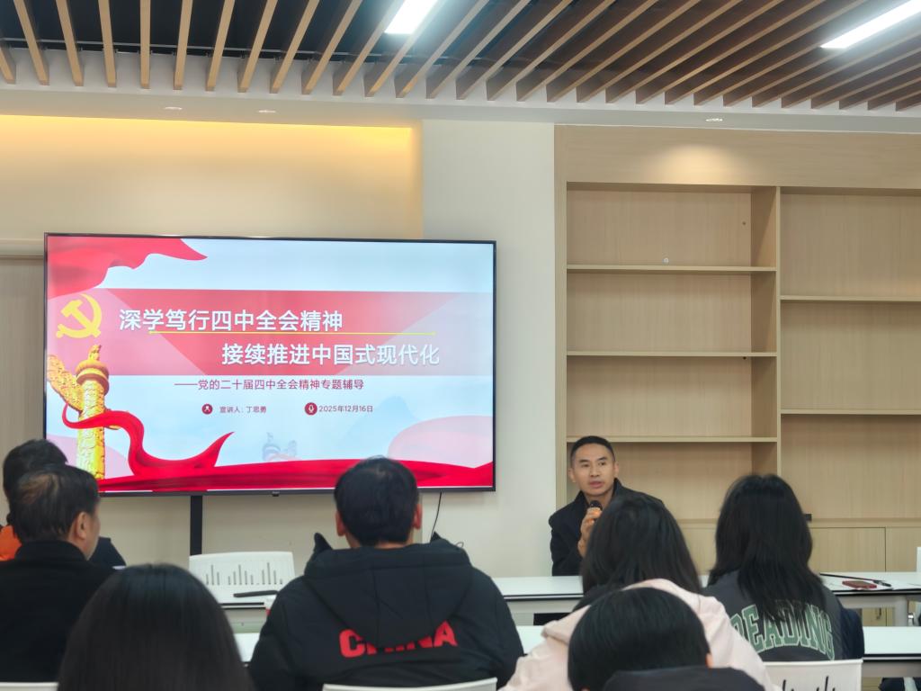 丁思勇副经理的宣讲从五个方面对党的二十届四中全会精神进行了全面剖析:一是“十四五”时期我国经济社会发展成绩单;二是在历史交汇点上把握战略抉择的时代价值;三是准确把握“十五五”时期我国发展环境基本特征;四是解码中国式现代化的“十五五”行动纲领;五是以实干担当把宏伟蓝图变为美好现实。宣讲中,他梳理了我国在科技突破、高水平对外开放、民生保障等领域的十二项标志性成果,解读了“十五五”规划中蕴含的现代化理论创新,结合国际百年变局与国内高质量发展的现实情况,为师生党员明确了中国式现代化的实践方向。
