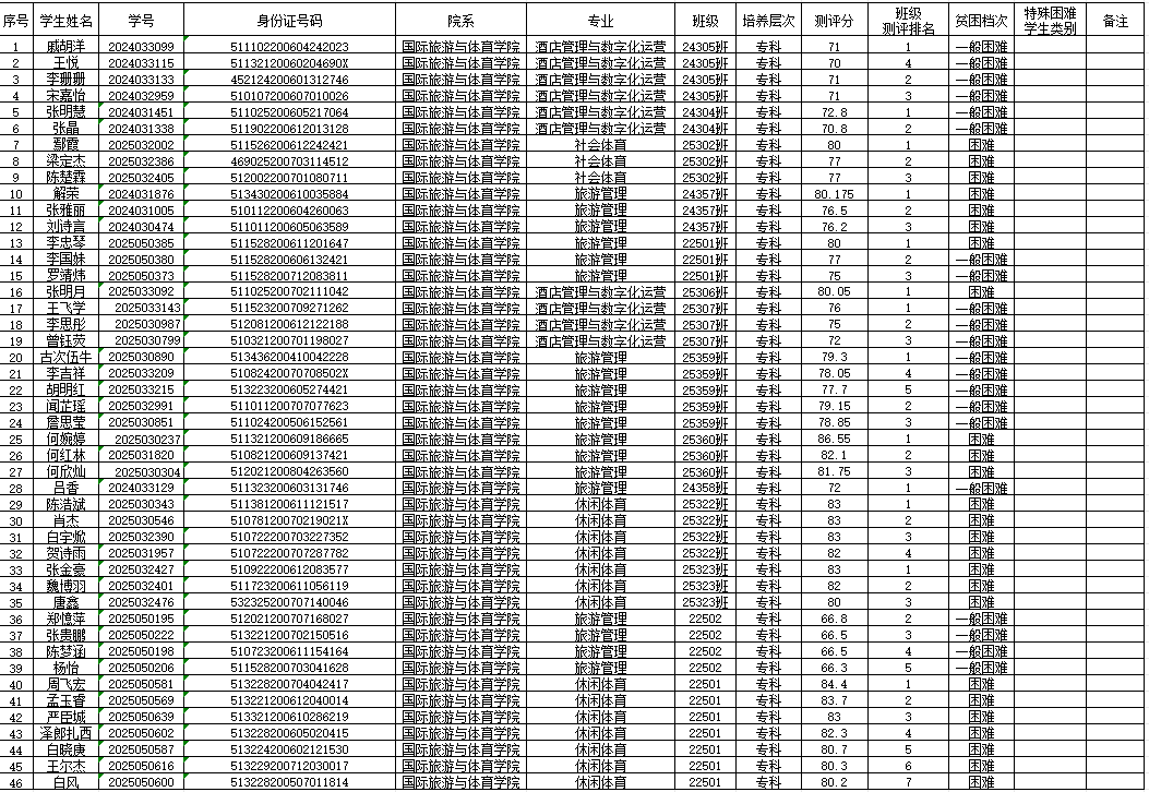 根据公司《关于做好2025-2026学年春季学期家庭经济困难员工认定工作的通知》文件精神,经个人申请,班级评议小组评定,班级公示无异议。公司认定小组认定,yl7703永利集团党政联席会于2026年3月20日审议通过,确定本次共46人被补充认定为家庭经济困难员工,其中困难25人,一般困难21人,现予以公示,名单公示详见下方附件表格。